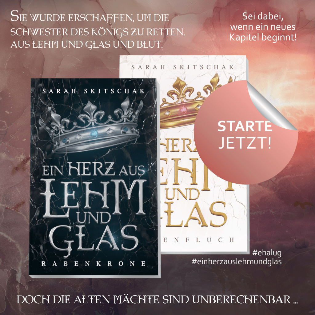 Du kannst das Projekt ab dem 02.08.2021 kostenfrei auf Wattpad verfolgen und kommentieren. Dort findest Du mich als »Sarah Skitschak« und als »sarah_autorin«. In meinem »Logbuch einer Keksautorin« und auf den ersten Seiten von »Ein Herz aus Lehm und Glas« findest Du zusätzliche Infos zum Projekt.